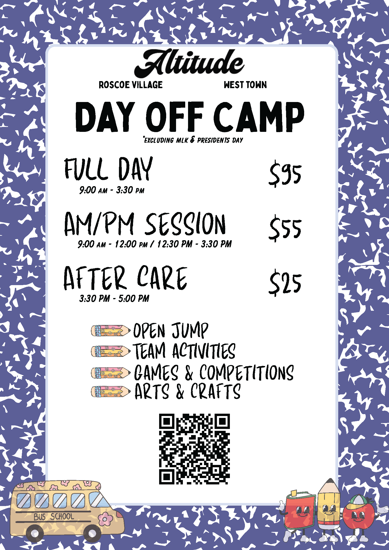DISCLAIMER: Cannot combine discounts. Altitude Chicago is not responsible for administering any medicines to campers. Registered sessions may be cancelled and refunded given 7+ days notice. Reschedules will be accommodated until the scheduled camp session starts.